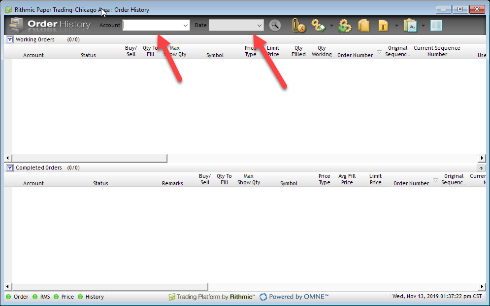 1. Left click the Order History button in the Launch window. Users now have the option of filtering trade activity by account or by date. 2. Left click the Account dropdown menu to filter by account number. 3. Left click the Date dropdown menu to ...