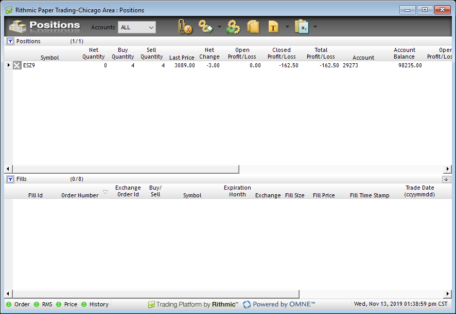 Once open users can monitor trade activity per contract basis. As you can see the Positions portion located in the upper half of the window is displayed per symbol.